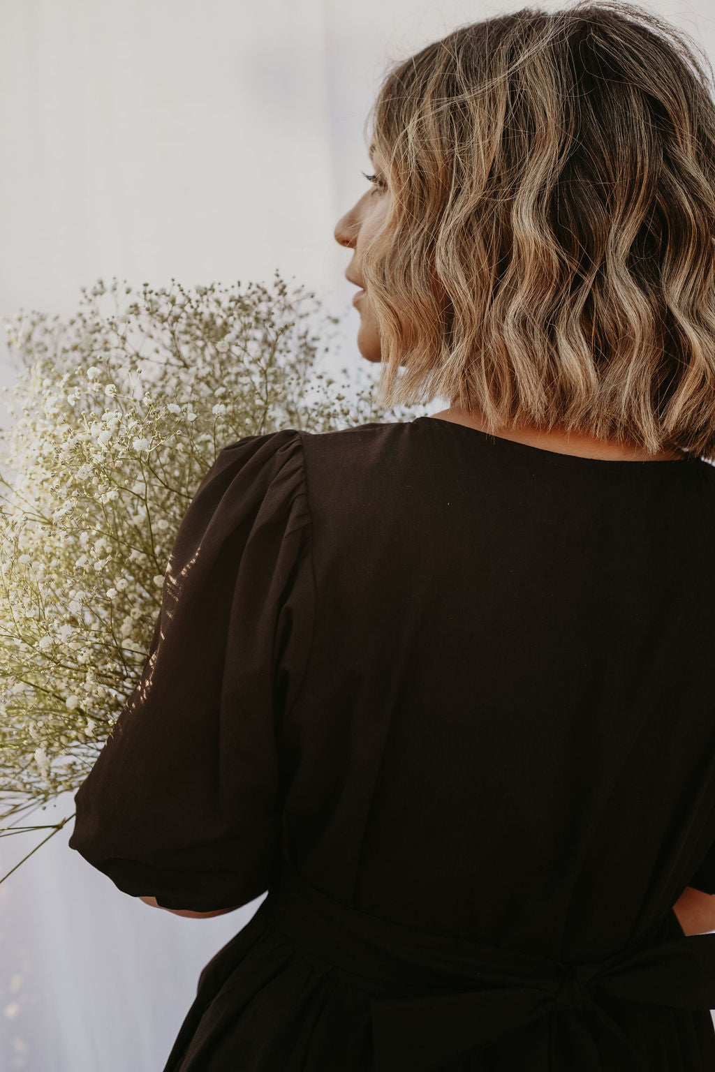Photographed is a size XS in our black 100% organic cotton poplin fabric with pockets, puff/gathered sleeves and the built-in side straps.