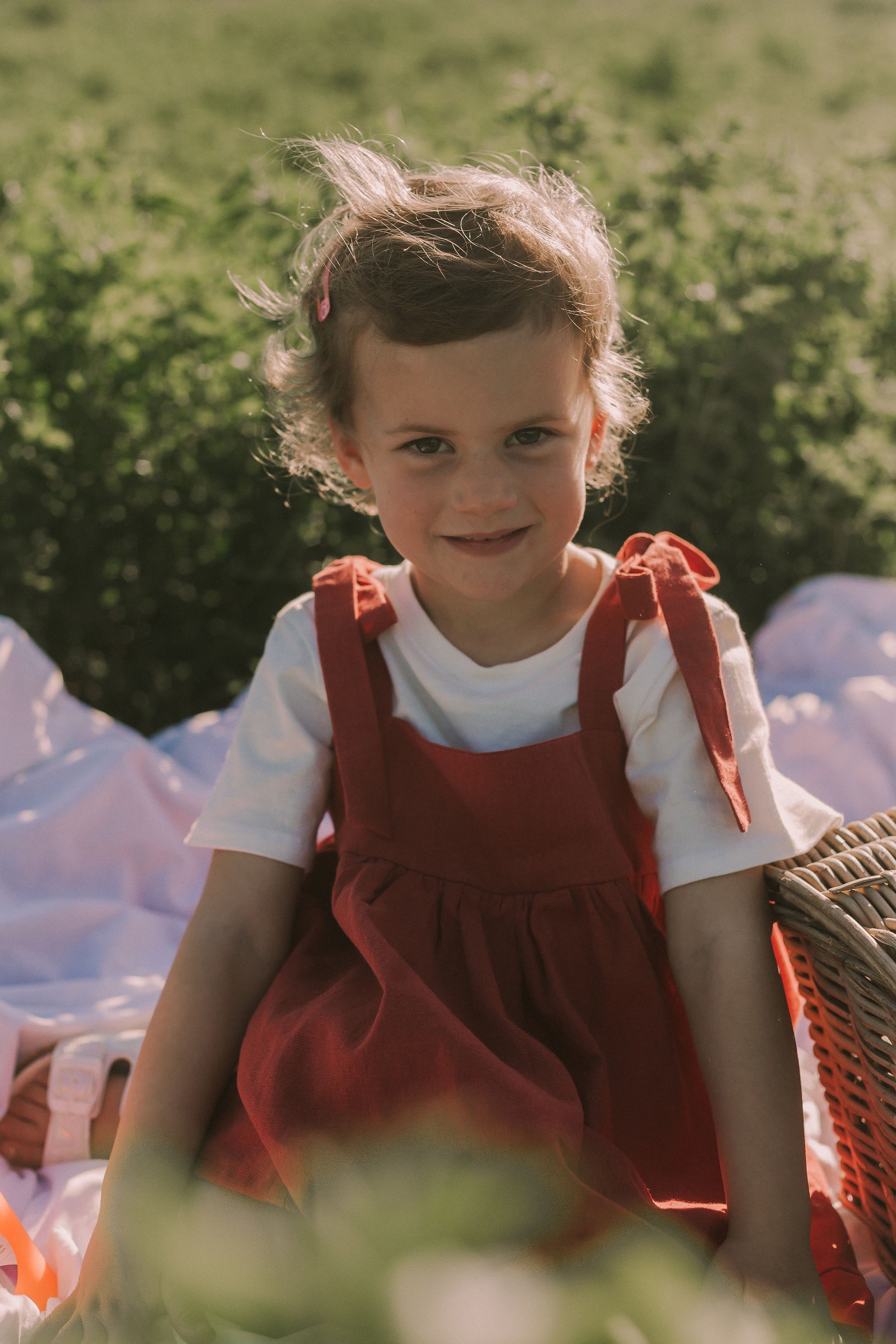 Photographed is a size 3 years in our raspberry Linen Cotton made from 55% pure linen and 45% cotton which creates a sturdy yet soft texture.