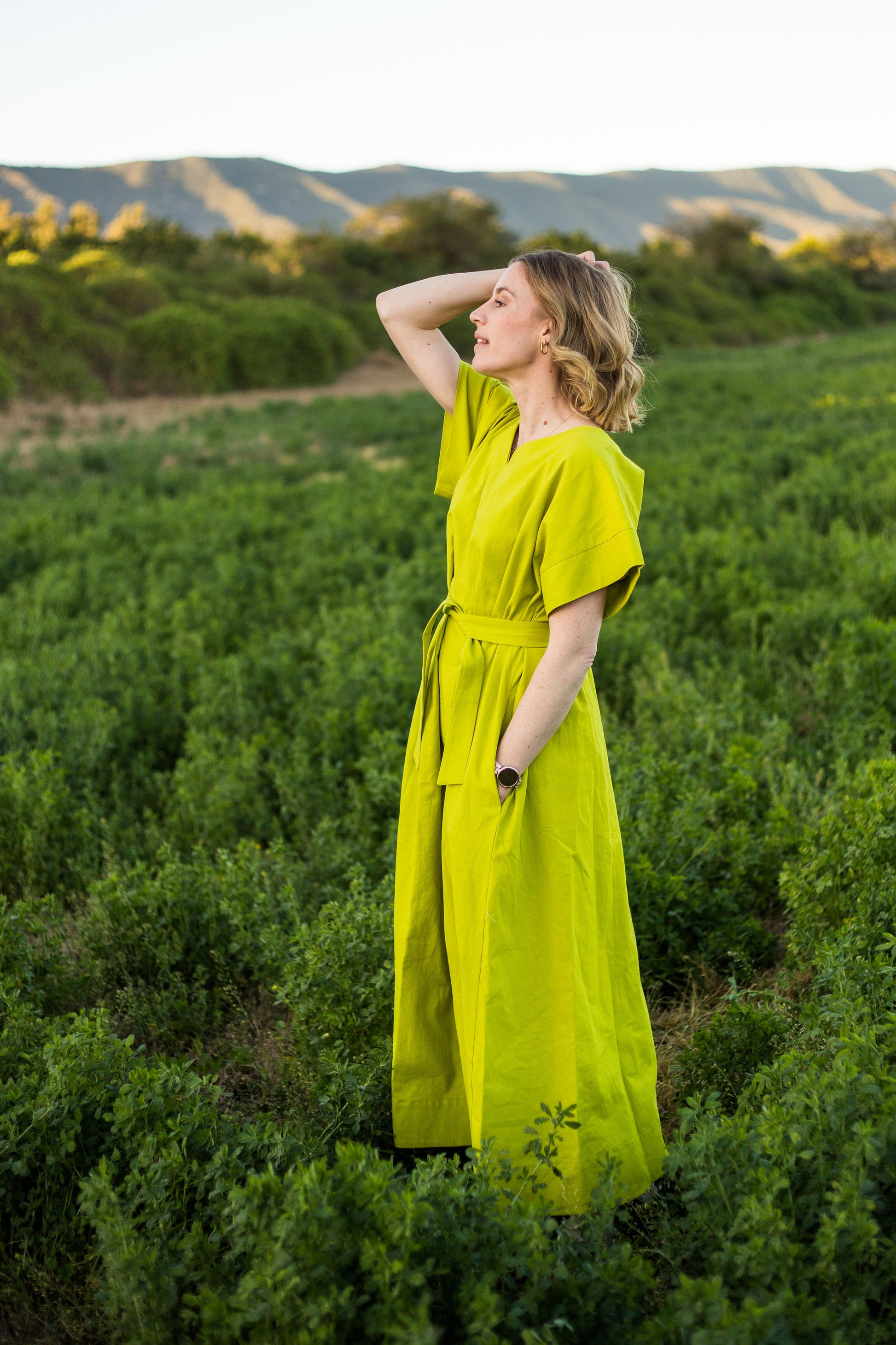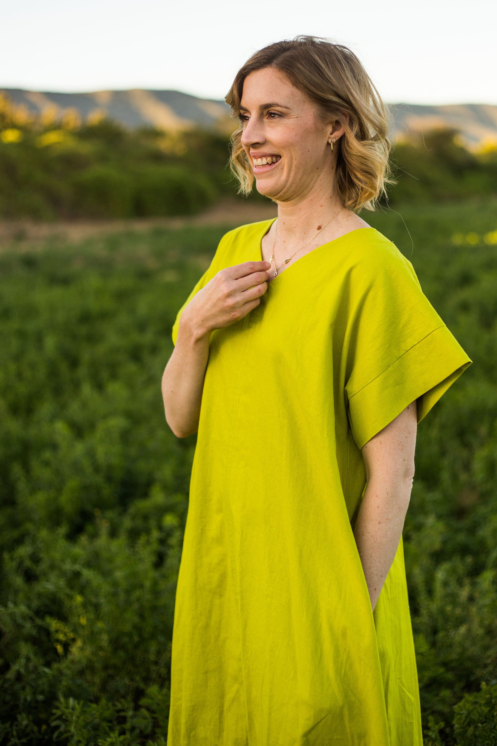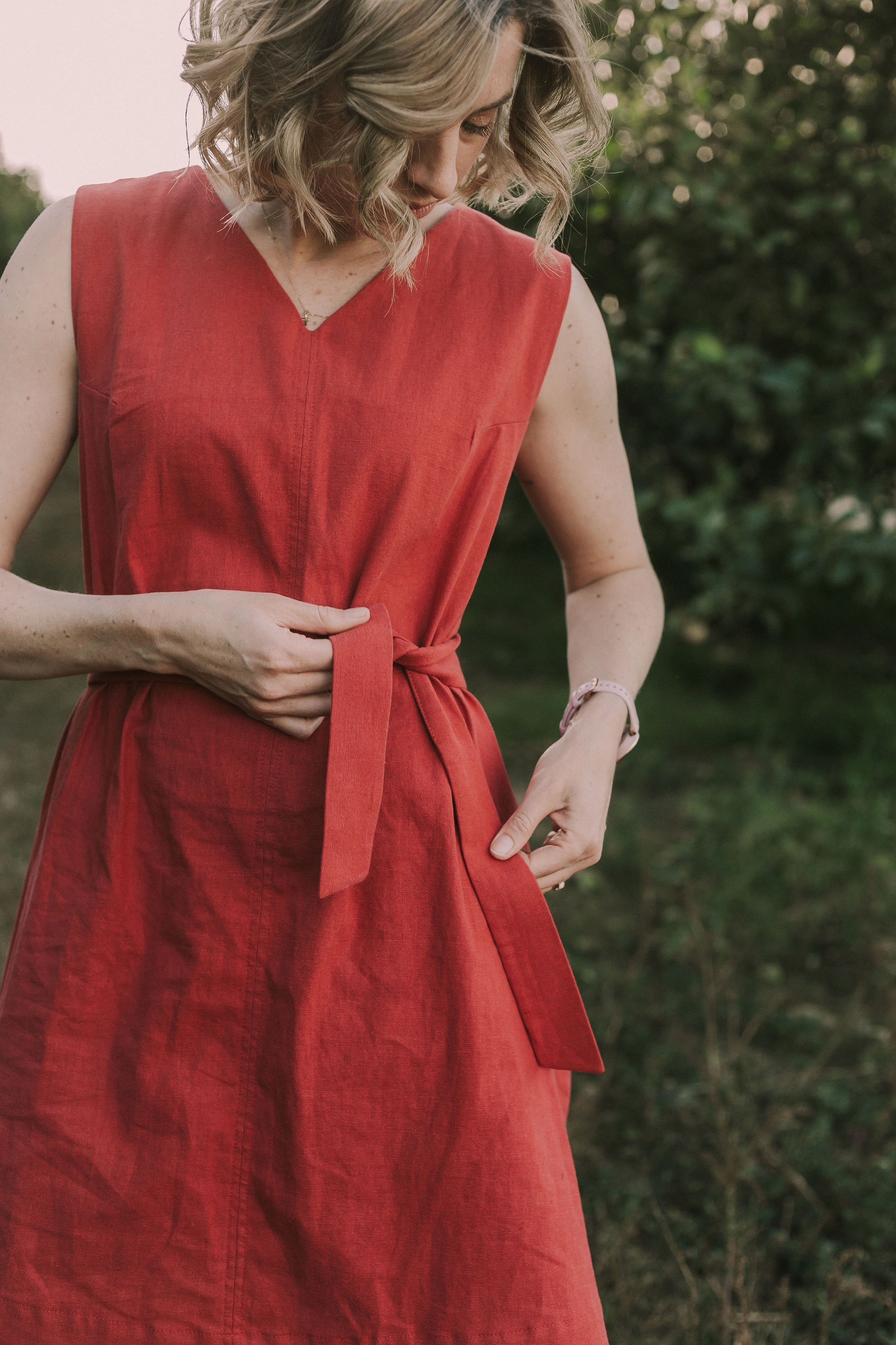 Photographed is a size small with the curved dropped sleeve in our lime Linen Cotton made from 55% pure linen and 45% cotton which creates a sturdy yet soft texture. Our sleeveless option is also shown in the raspberry colour.