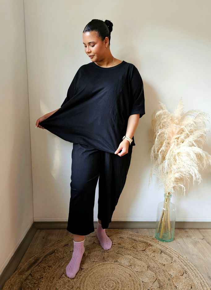 Photographed is also size XL in our black 100% pure cotton single knit fabric. Please note that this has been preshrunk but slight shrinkage may still take place after the first wash - please cold wash inside out.