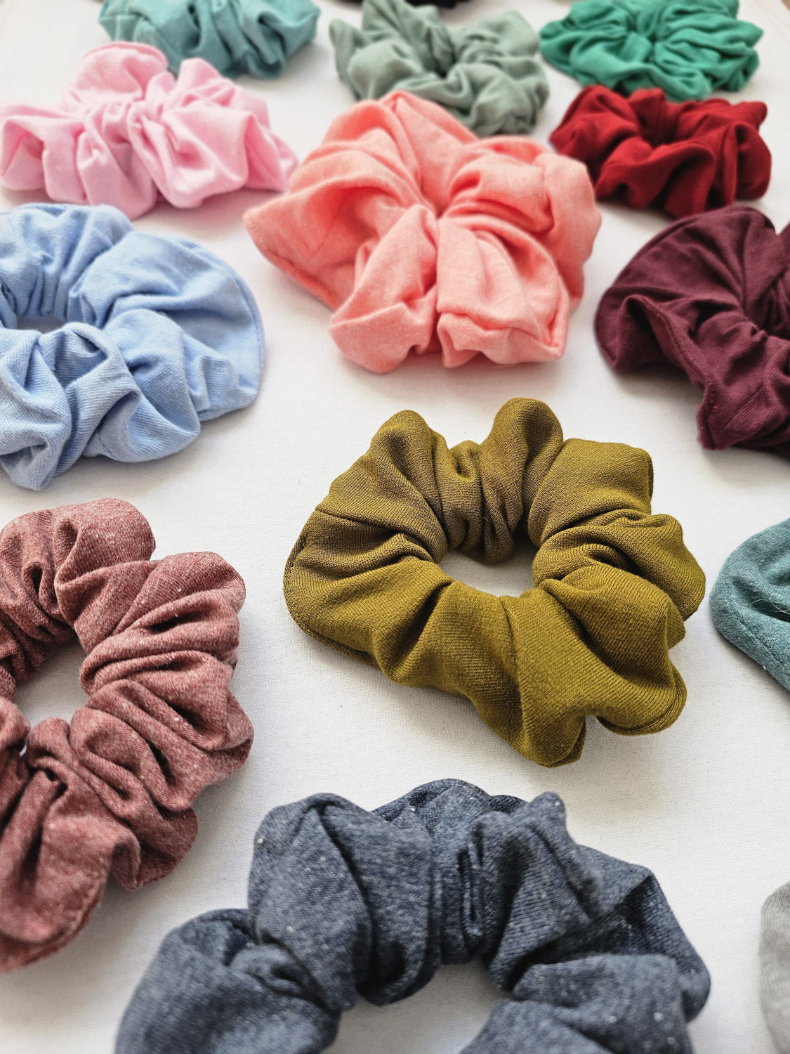 We have these comfortable and hair friendly scrunchies in a thin, normal and thick size, and they are available in all our current website materials!