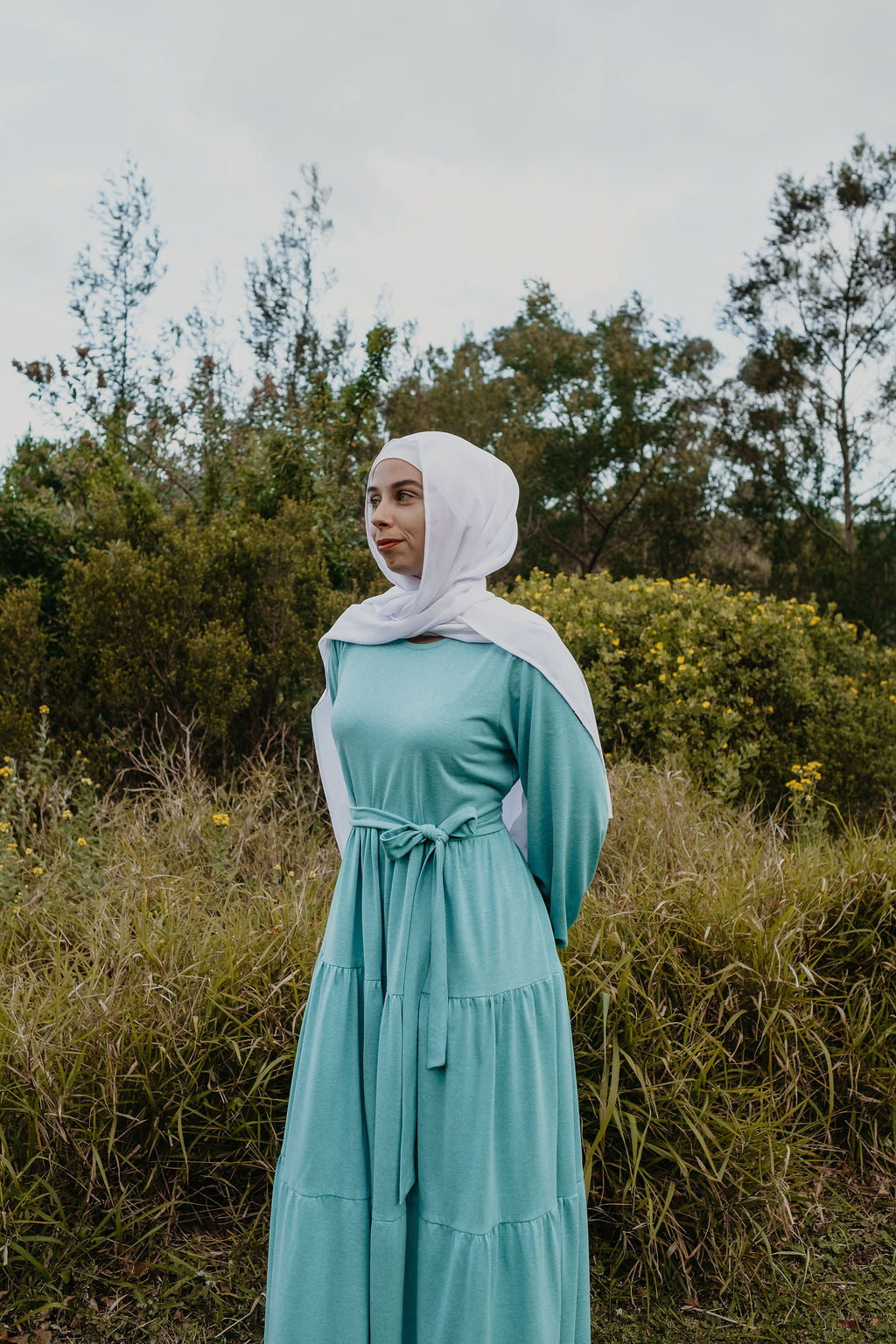 Photographed is a size small in our aqua recycled plastic fabric with long sleeves.