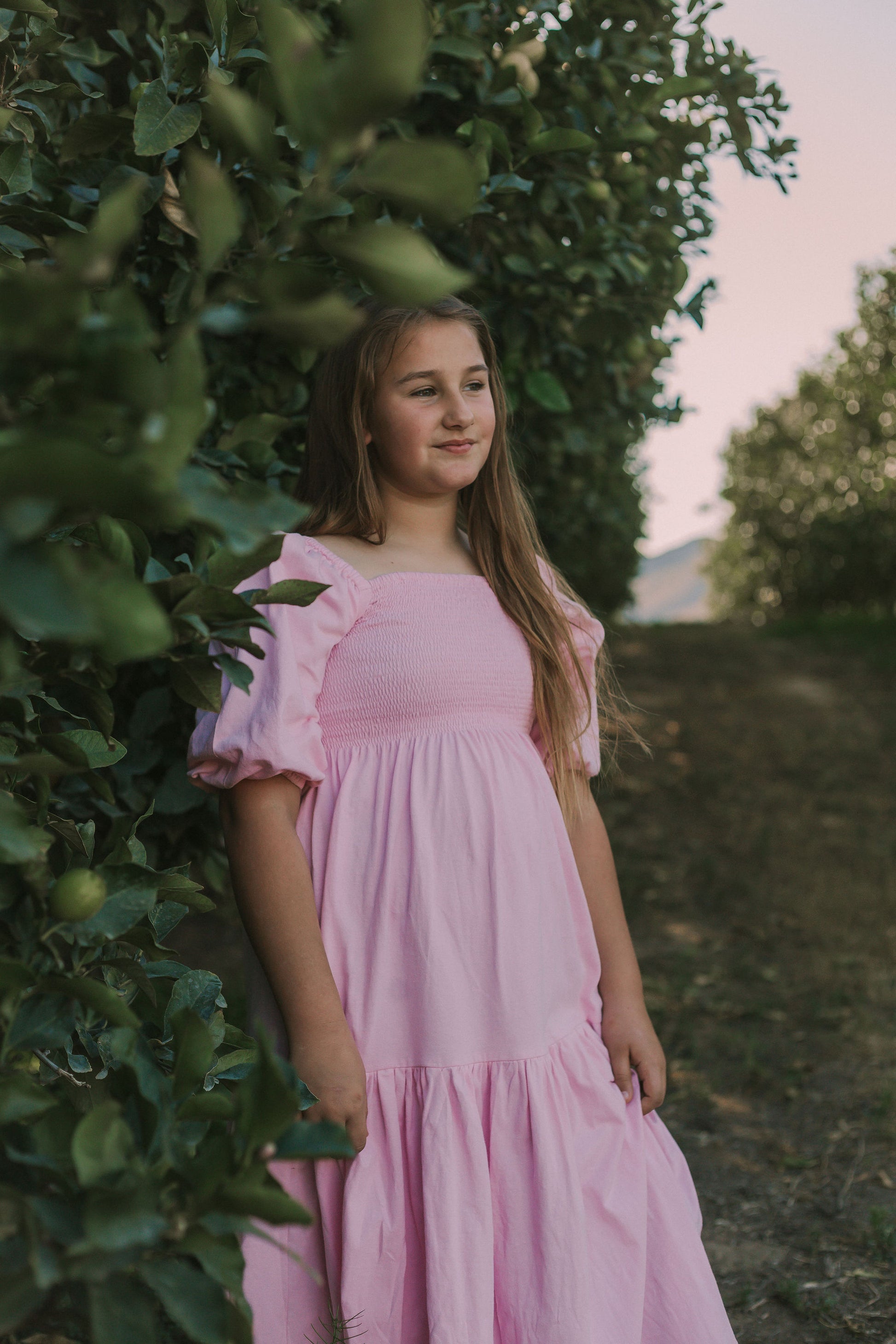 Cuteness and comfort overload in this pretty, smocked bodice, tiered dress. The sleeve is gathered on the shoulder and elasticated on the arm (but nothing tight or clingy). The sizing and length of the dress allows for kids' speedy growth.